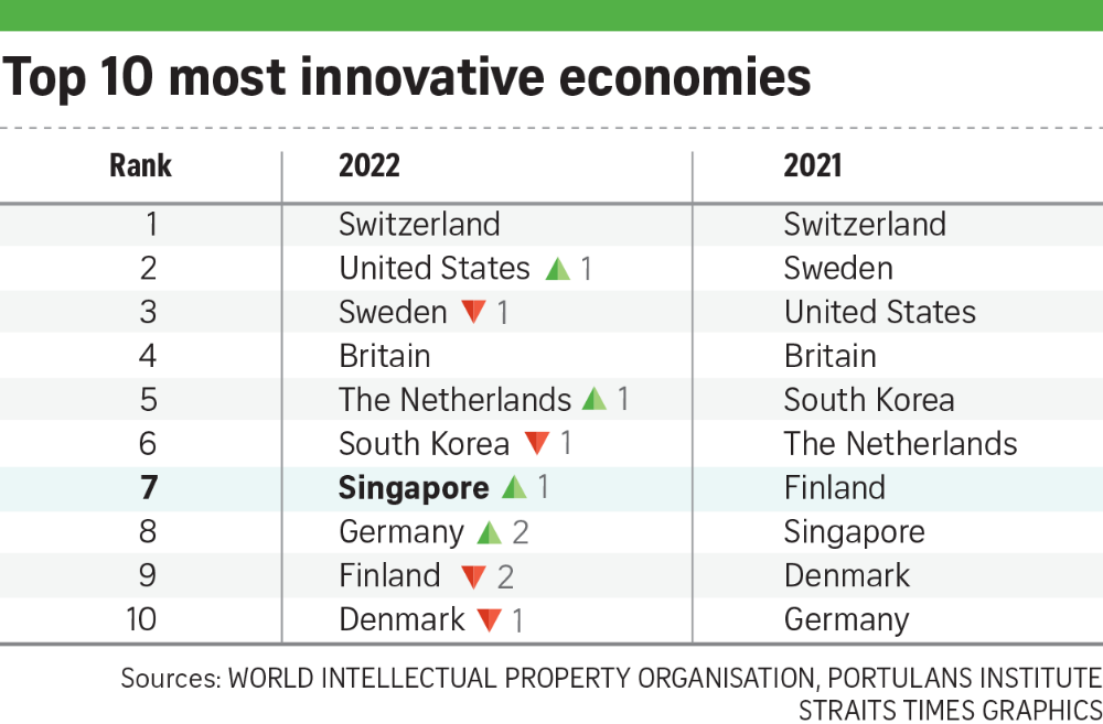 Singapore is now the seventh most innovative economy in the world, up one spot from its ranking in 2021.