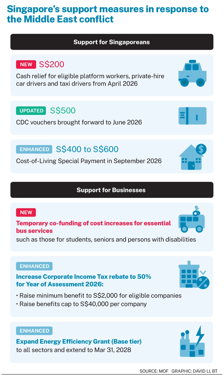As for households, Siow said Singapore will also bring forward the next tranche of S$500 in CDC Vouchers to June this year, from the original target of January 2027, and increase payouts under the Cost-of-Living Special Payment to ease cost pressures amid uncertainty from the Iran war.