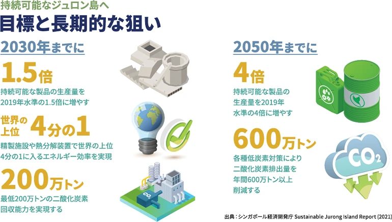 そしてこれを機に、ジュロン島を持続可能な化学・エネルギー産業拠点へと転換するために、企業誘致を進めるEDBは2021年11月、「サステナブル・ジュロン島」を発表。ジュロン島の化学・エネルギー産業において、2050年までに①持続可能な製品の生産量を2019年比で4倍に引き上げ、②低炭素ソリューションにより年間600万トン以上のCO2排出量を削減するという野心的な目標を掲げたのである。